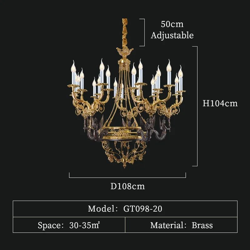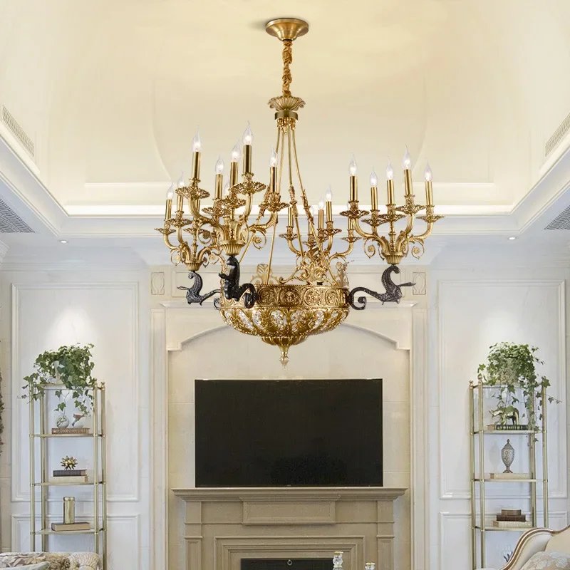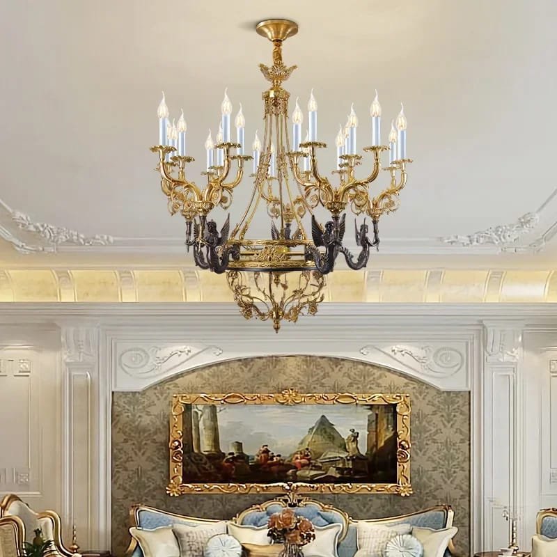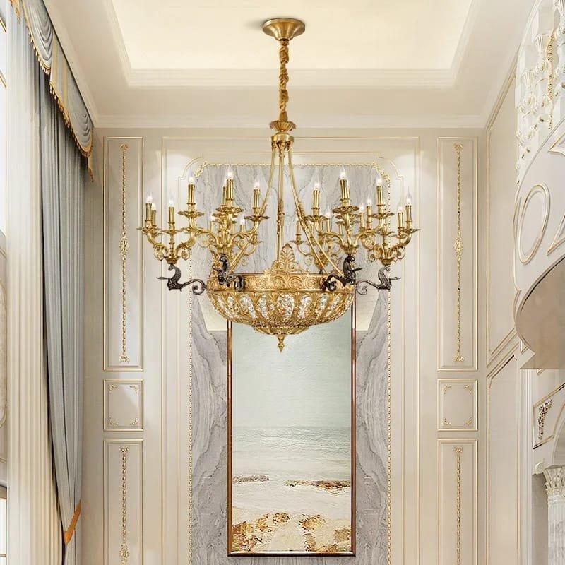 French Style Classic Brass Large Chandelier Villa Hotel Hall Living Room European Dewaxed Copper Candle Pendant Lights.