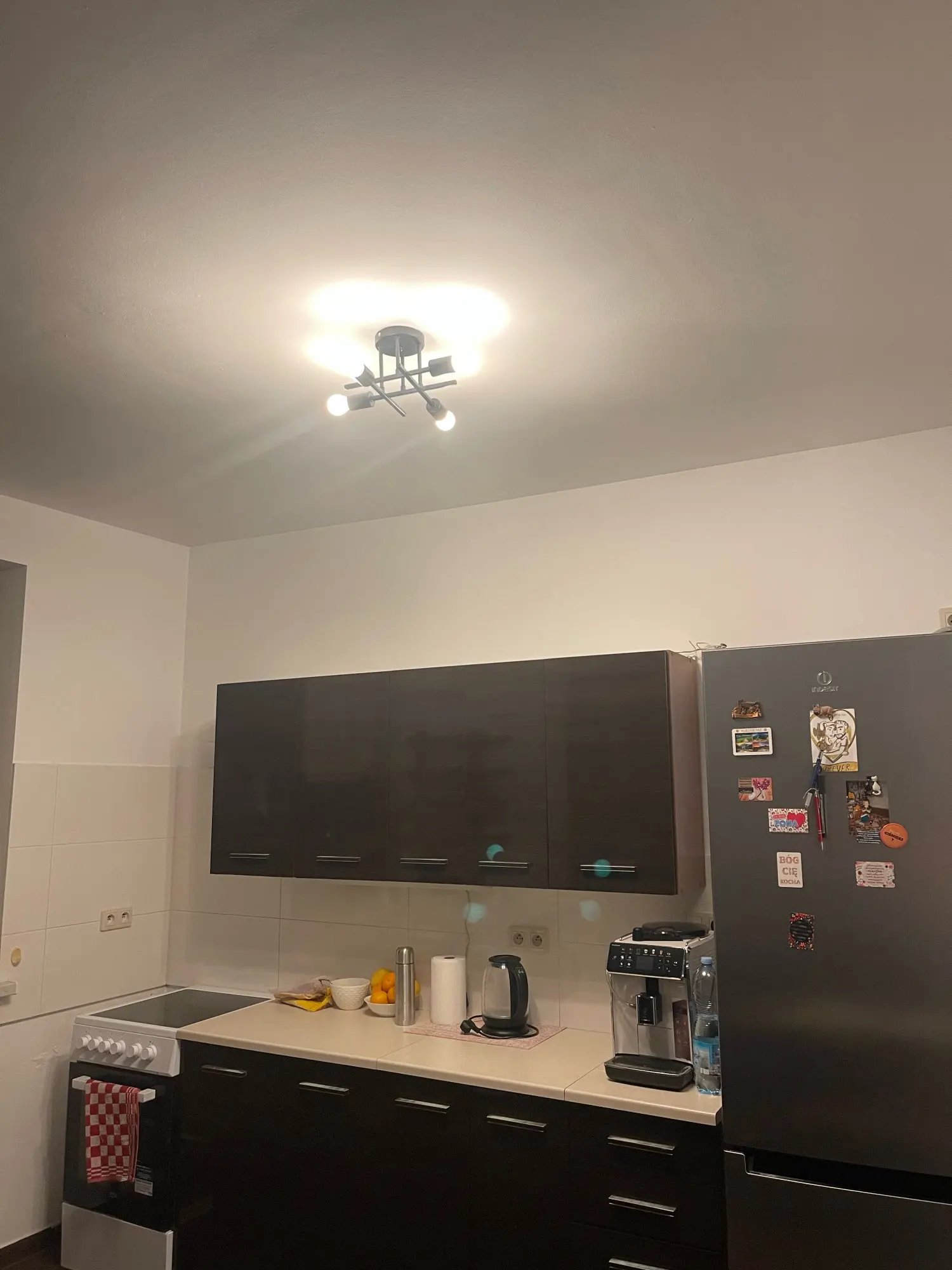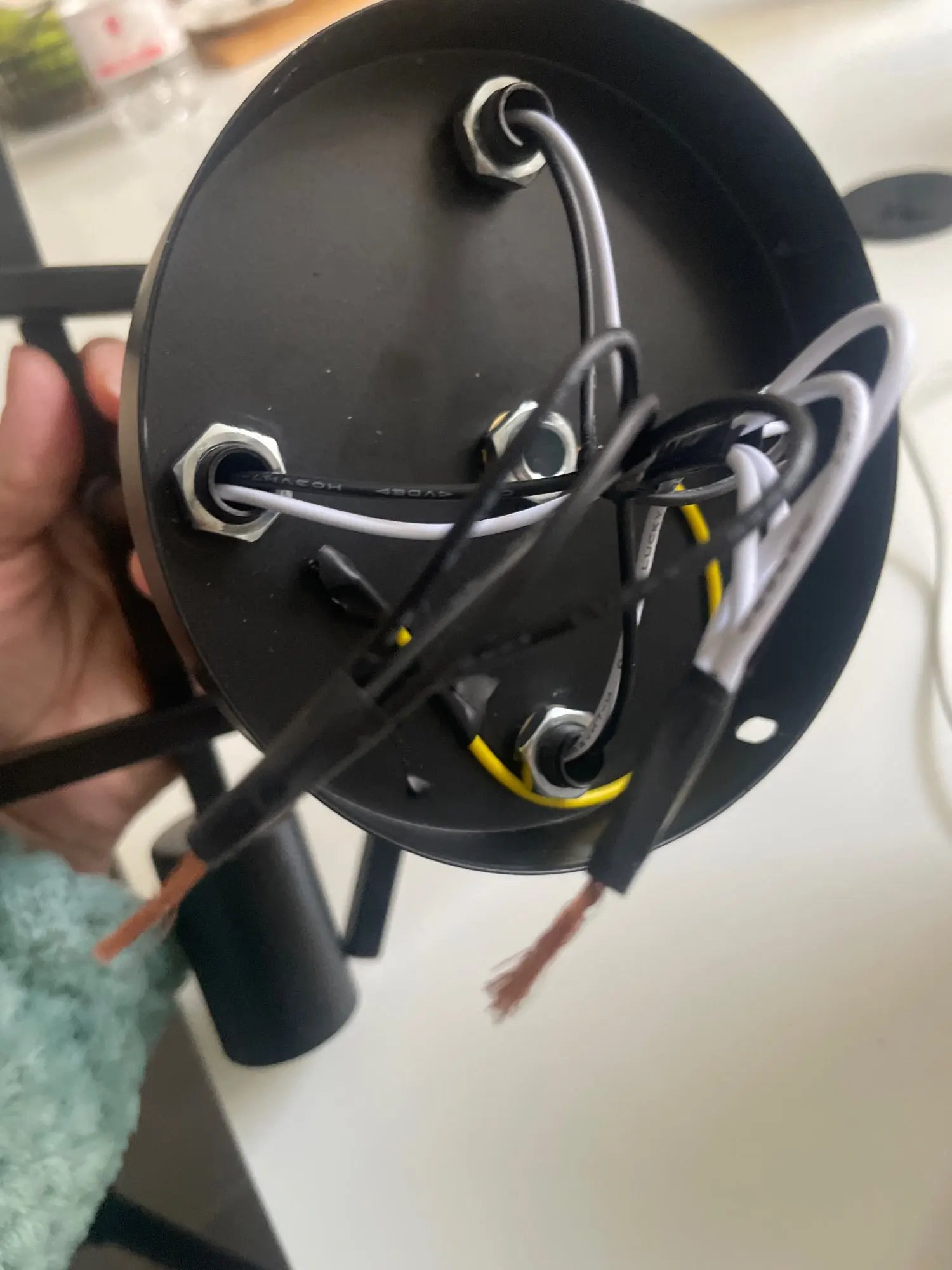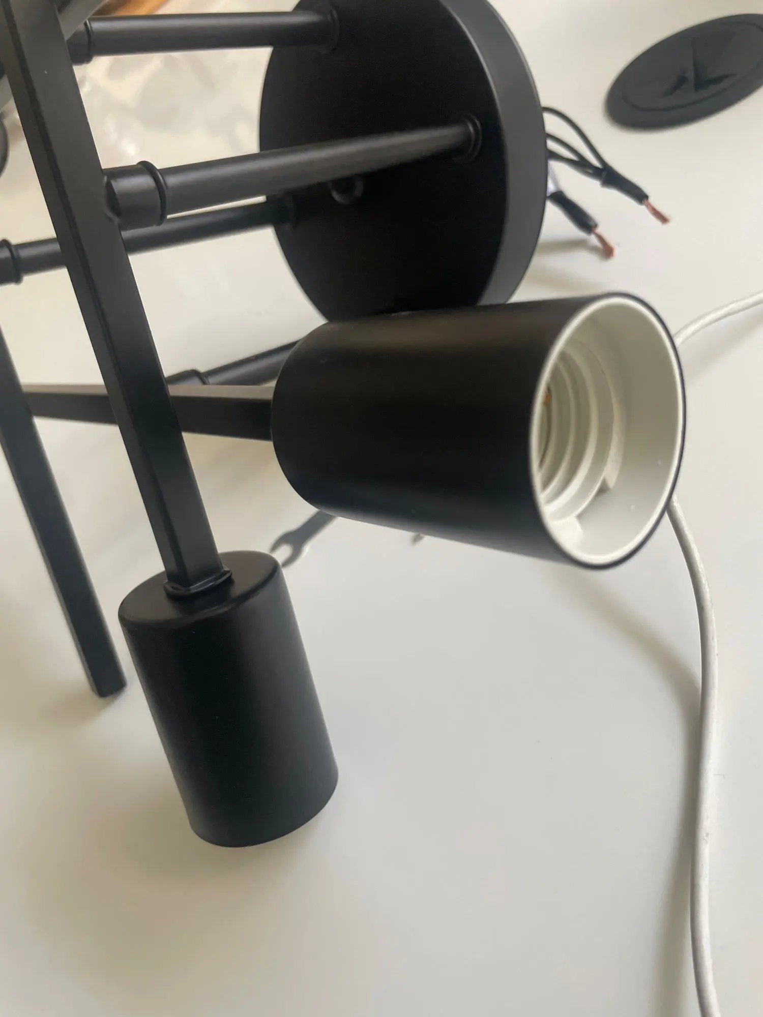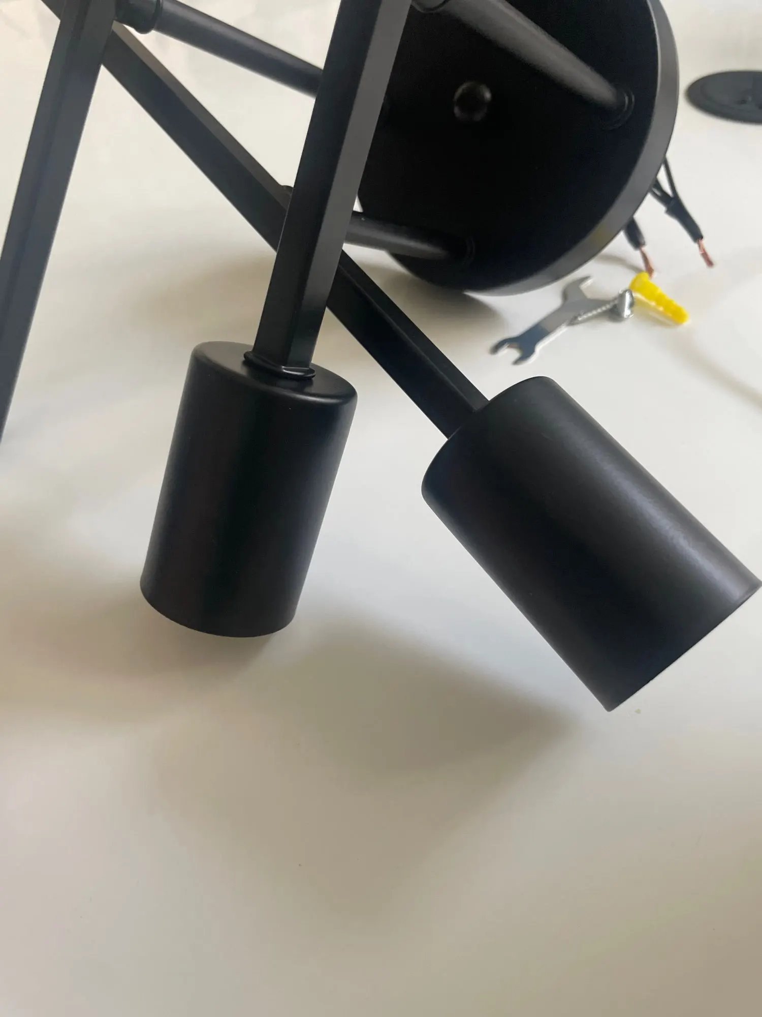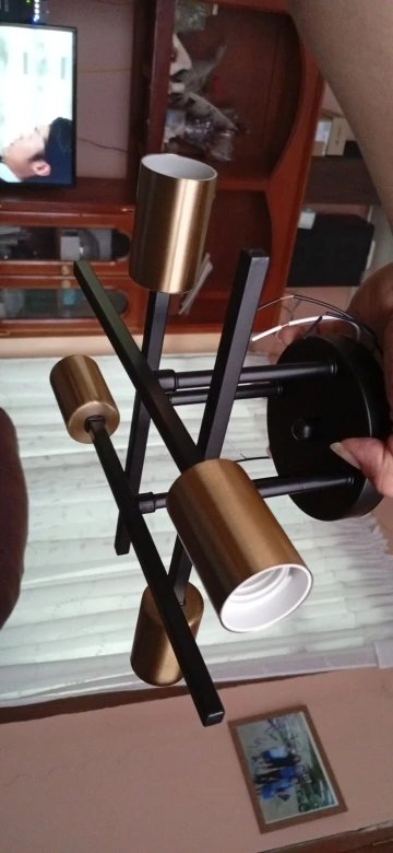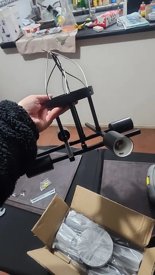 Żyrandol bardzo łatwy w poskładaniu, można regulować kąt nachylenia poszczególnych przęseł. Brak żarówek w zestawie to żaden problem, tylko dziwne złączki do kabli – pierwszy raz spotykam się z łączeniem sprężynowym